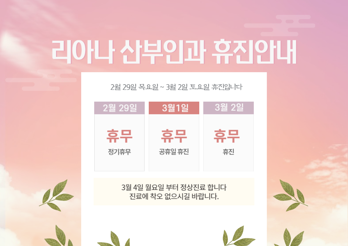 | [공지] | 26년 2월 설연휴휴진안내 | 리아나산부인과의원 | 2026-01-31 | 조회수:132 | 추천수:1 | |
