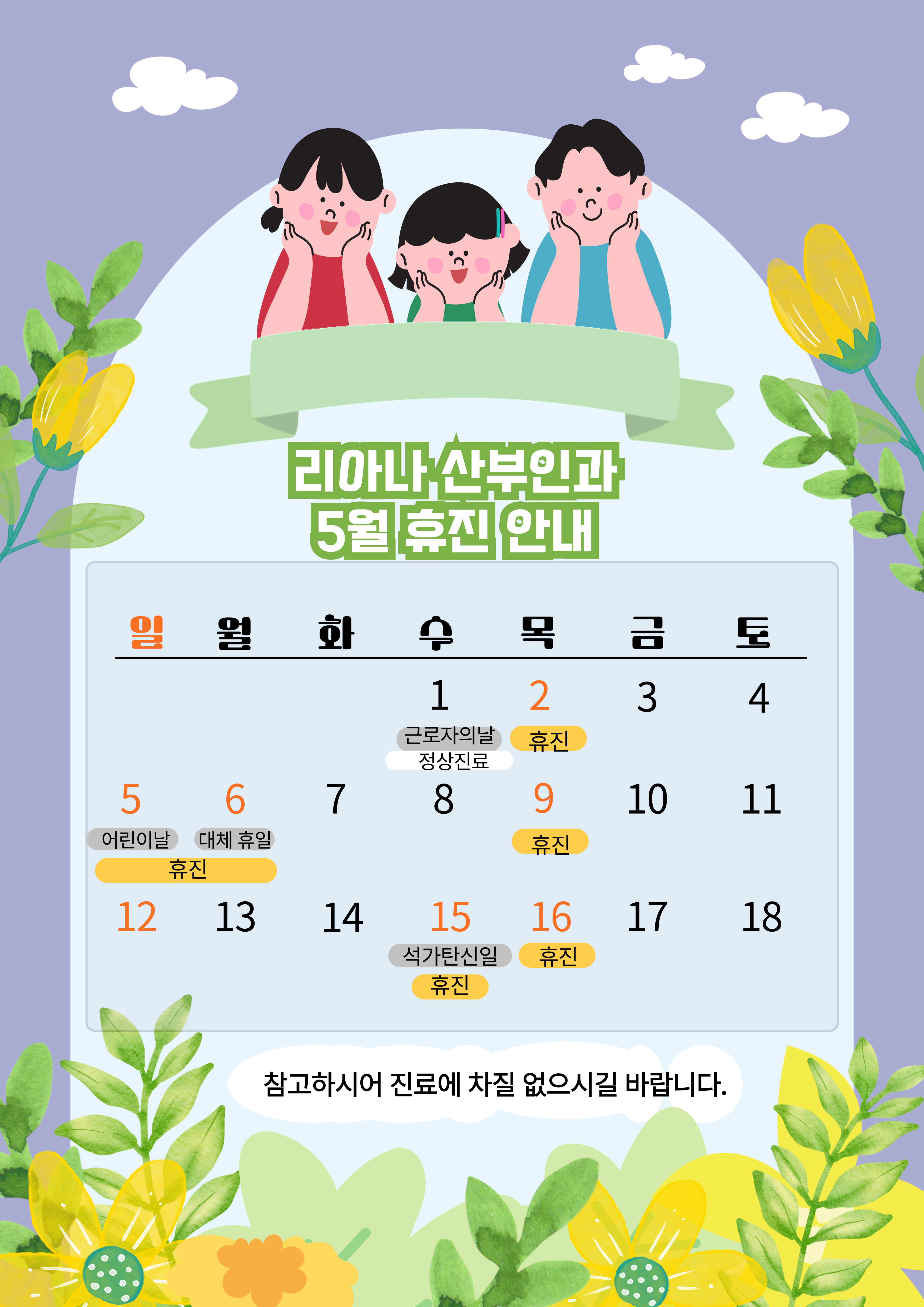 | 3 | 5월 휴진안내 | 리아나산부인과의원 | 2024-05-01 | 조회수:530 | 추천수:1 | |